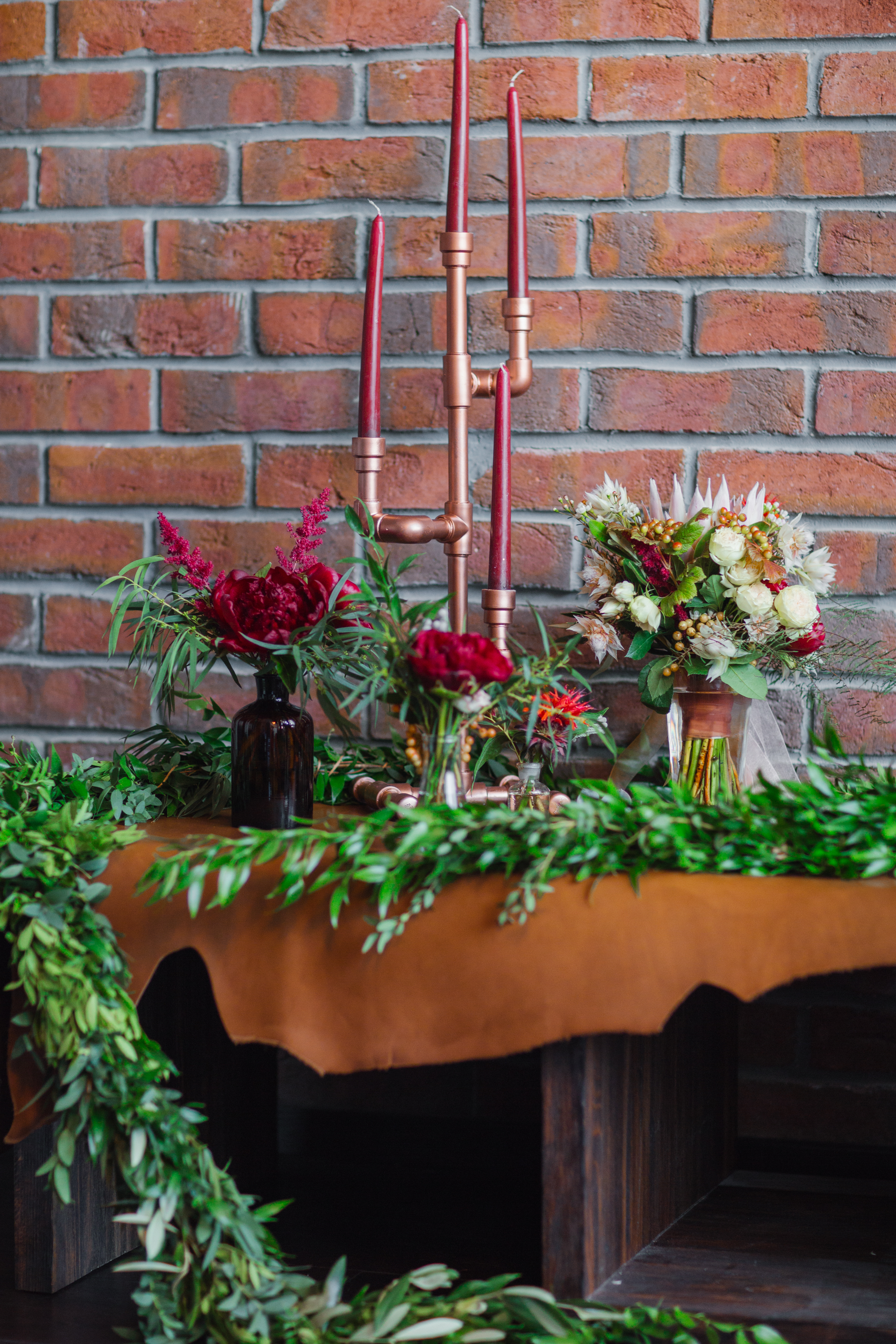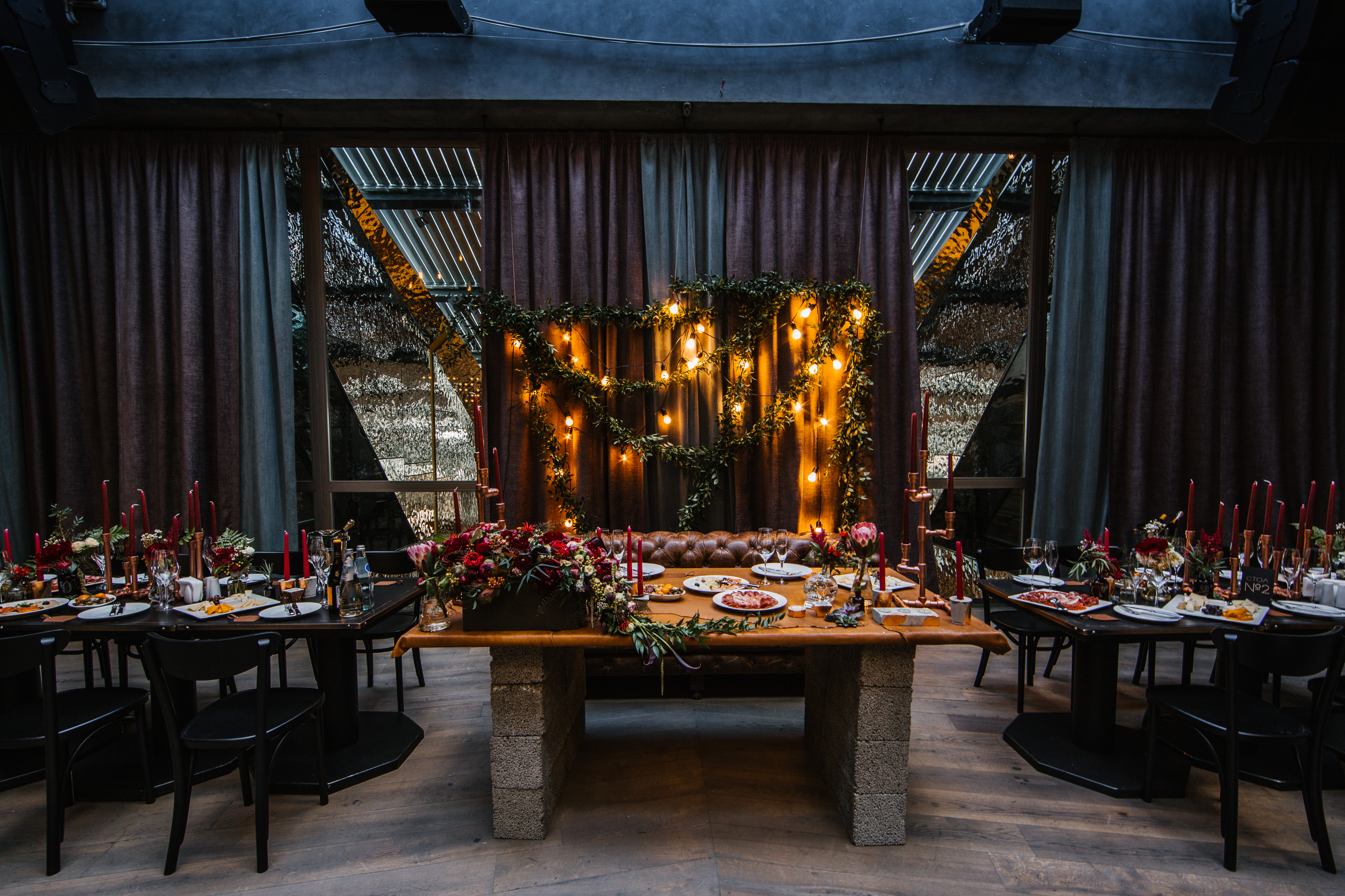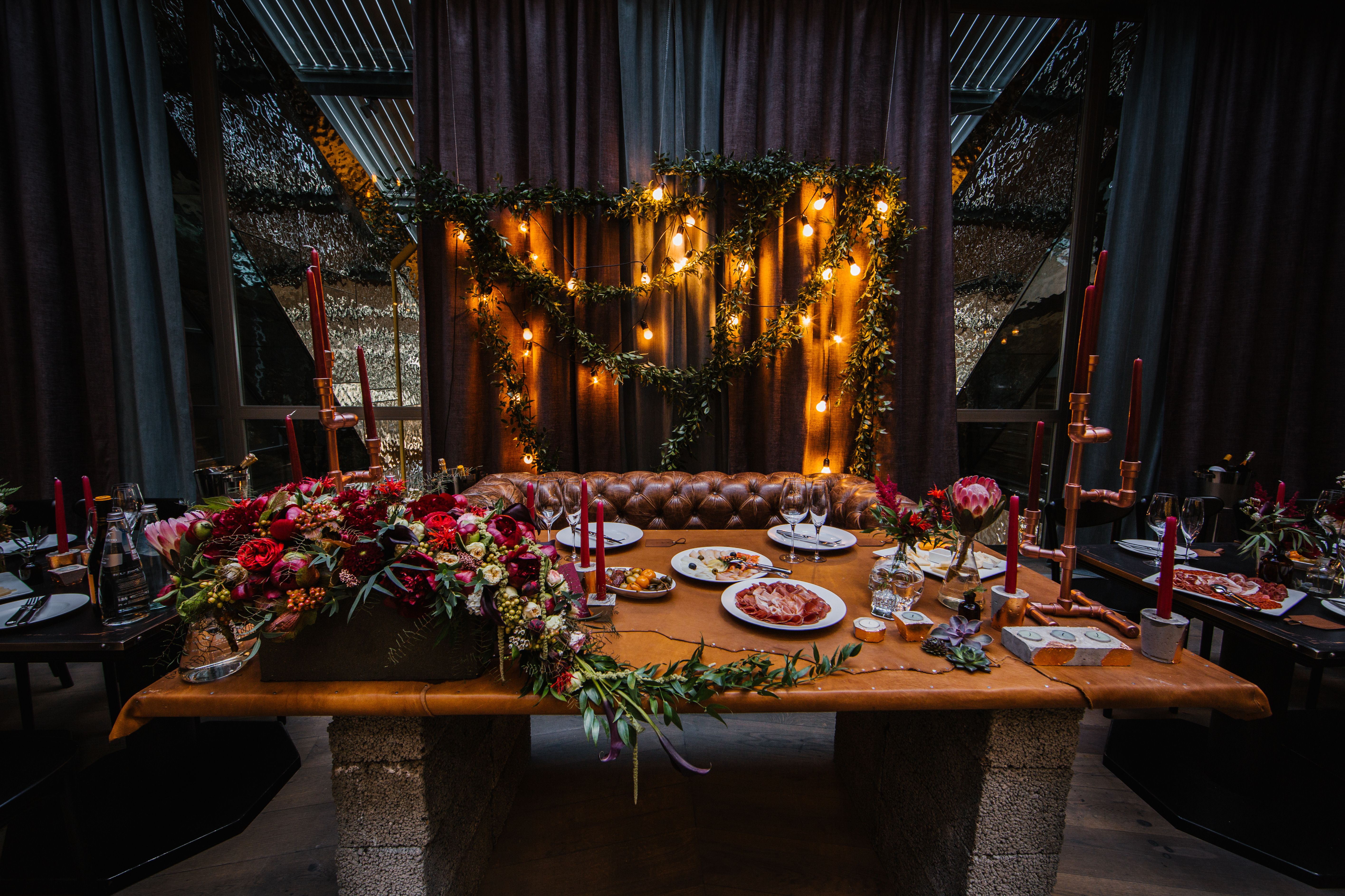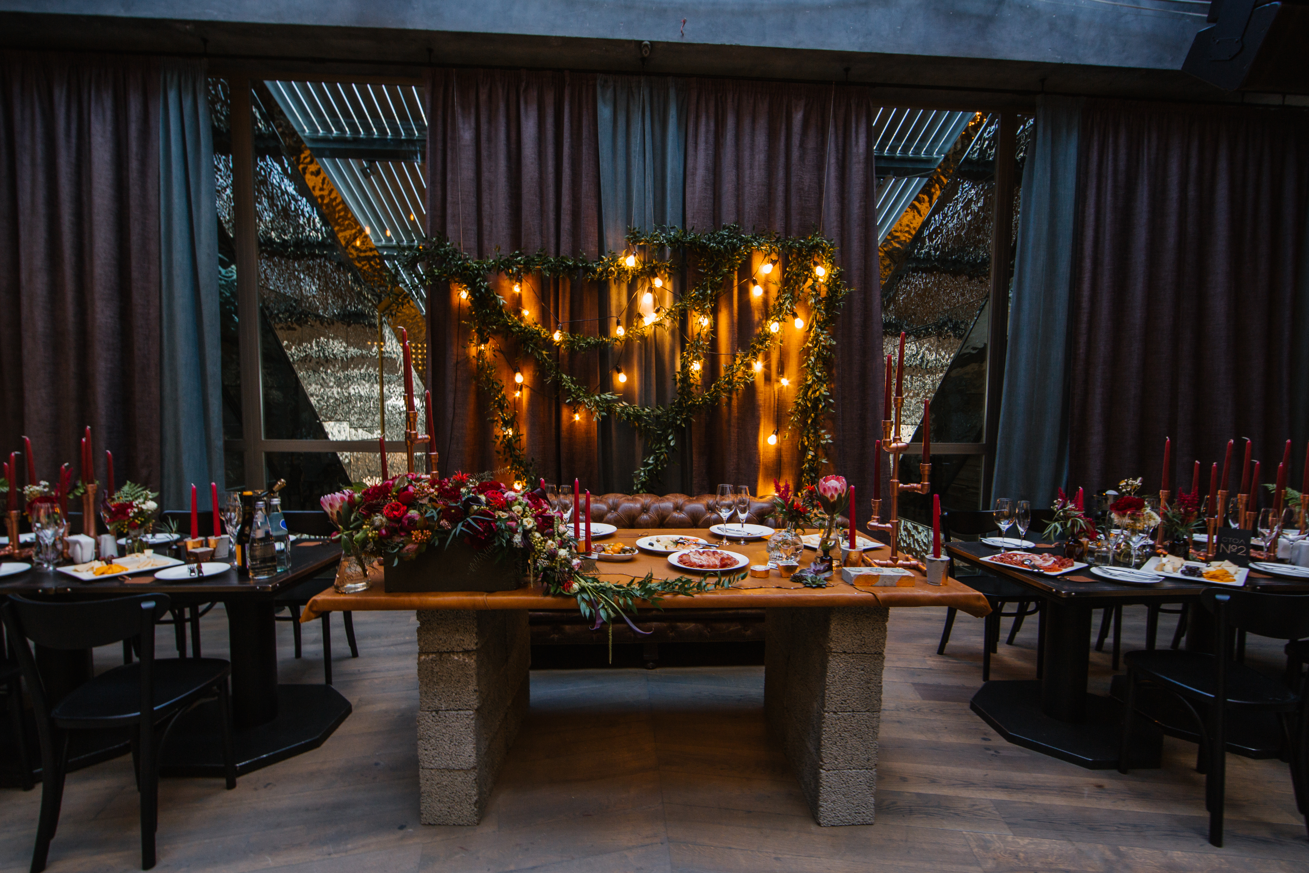 Основные детали: бетон, дерево, свечи, кожа, медные элементы декора и лампы Эдиссона.