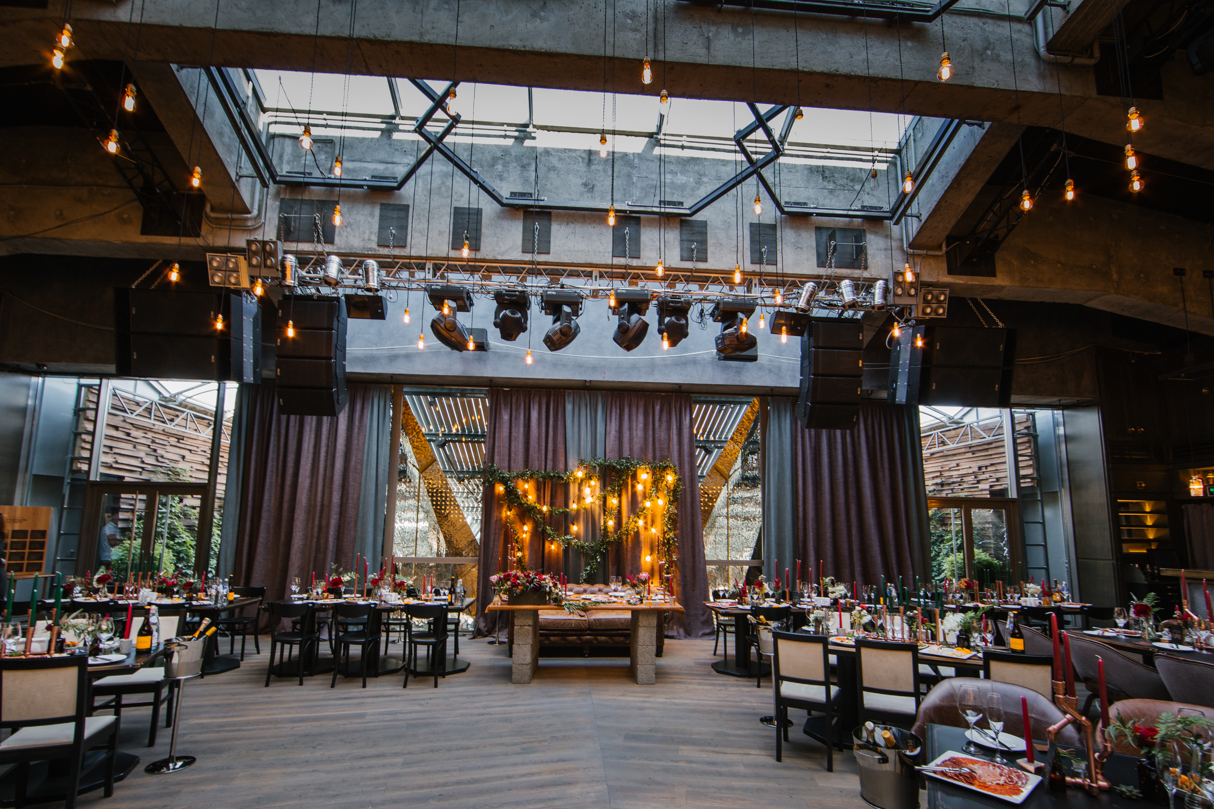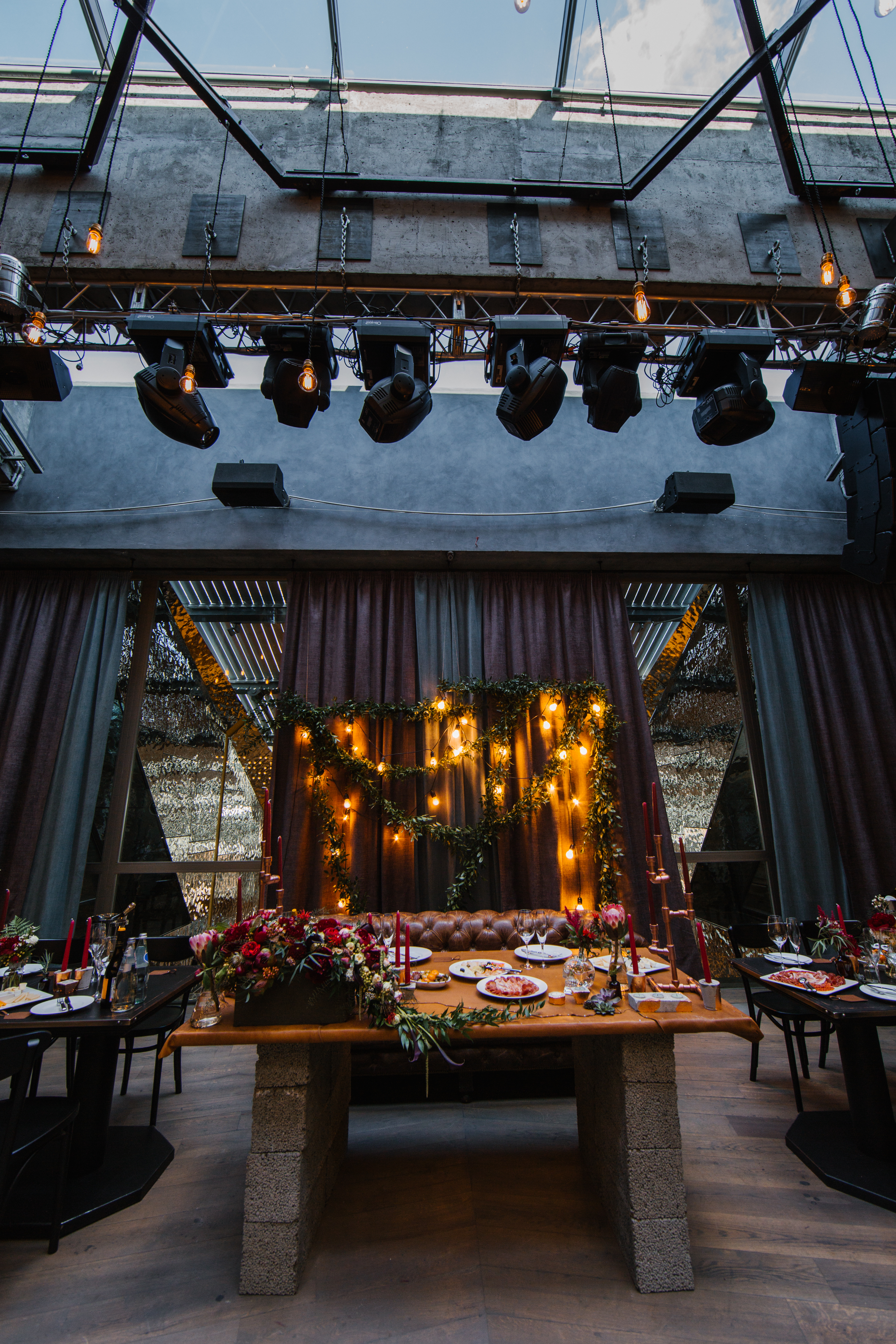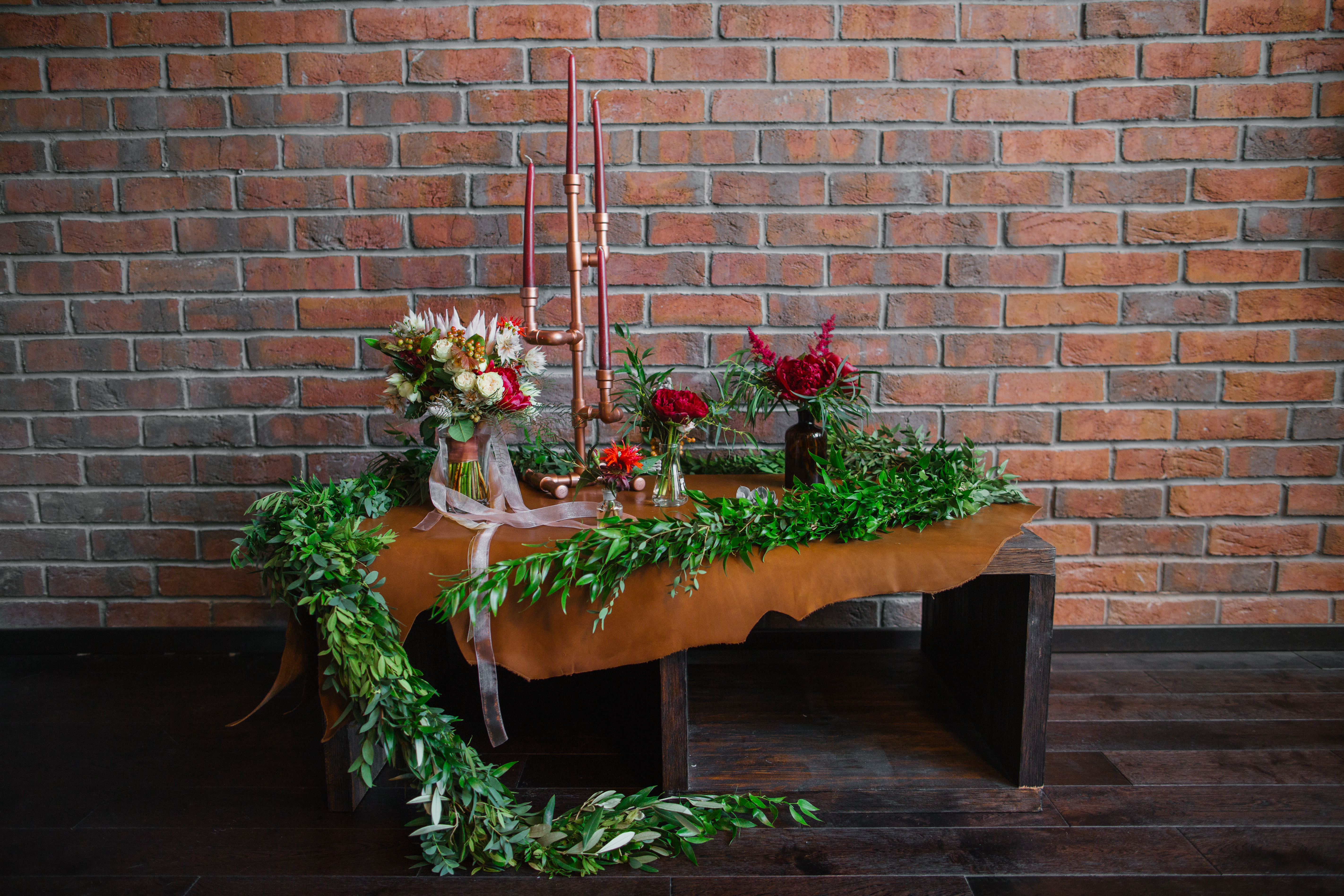 Основные детали: бетон, дерево, свечи, кожа, медные элементы декора и лампы Эдиссона.