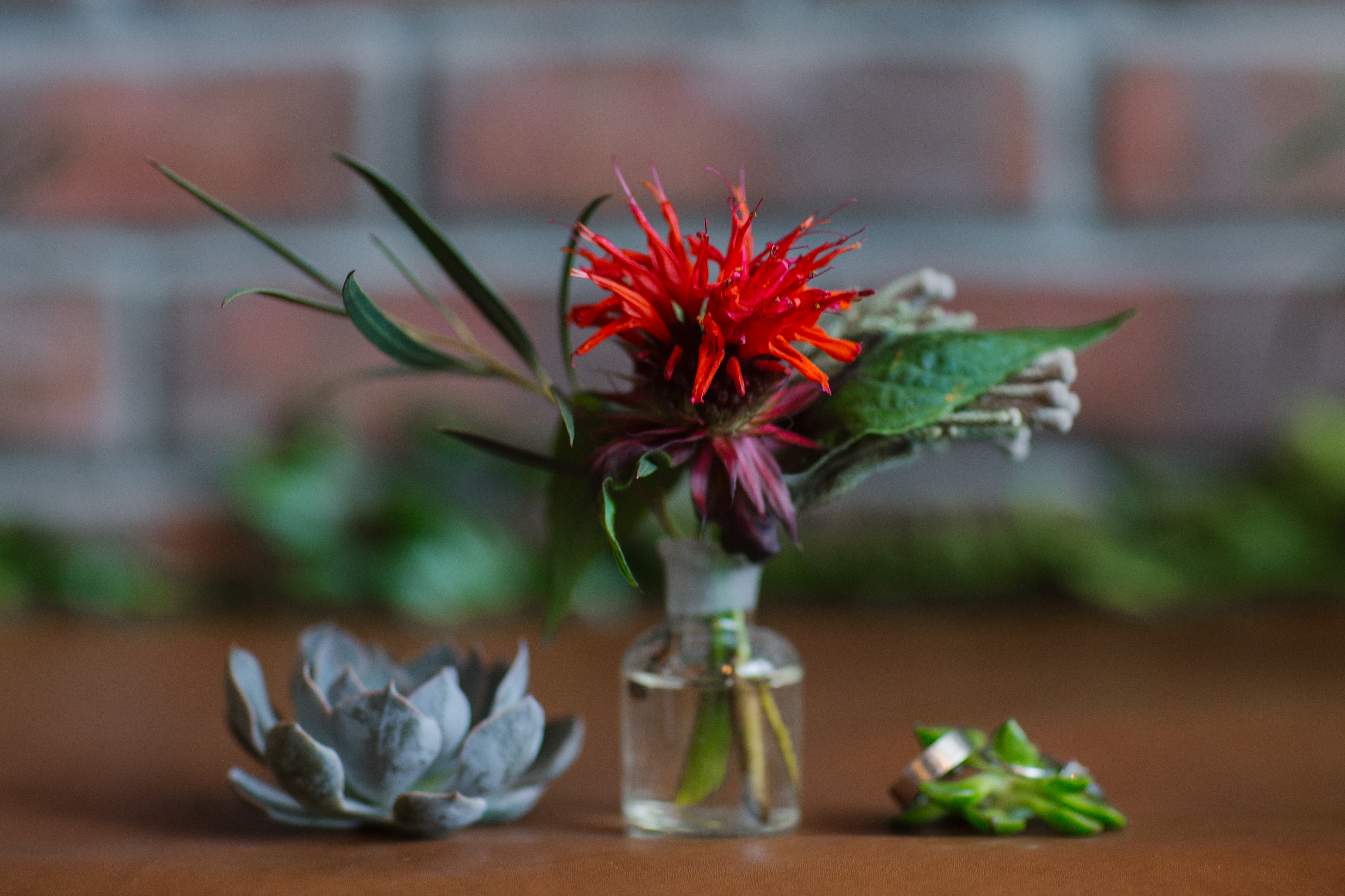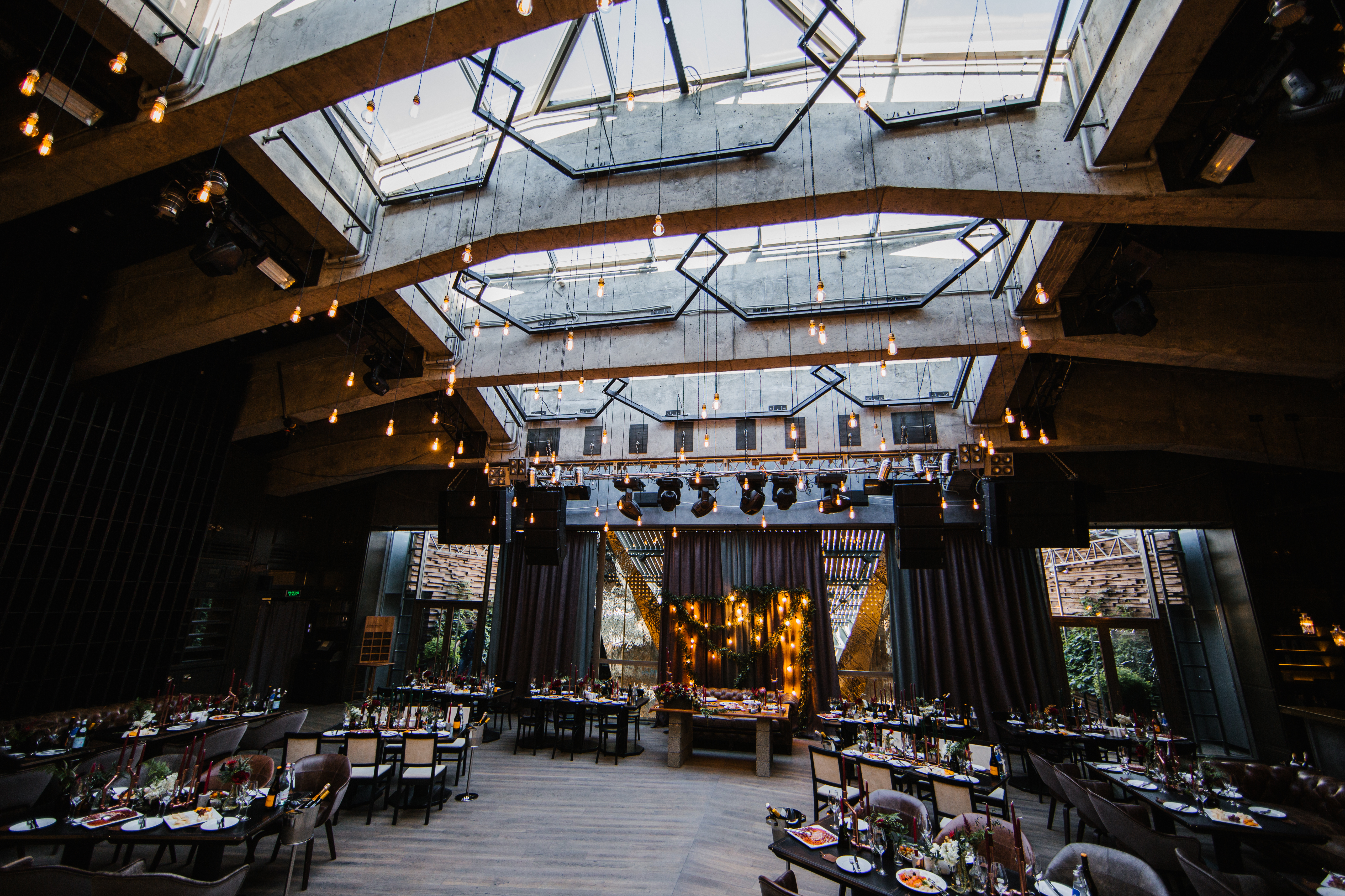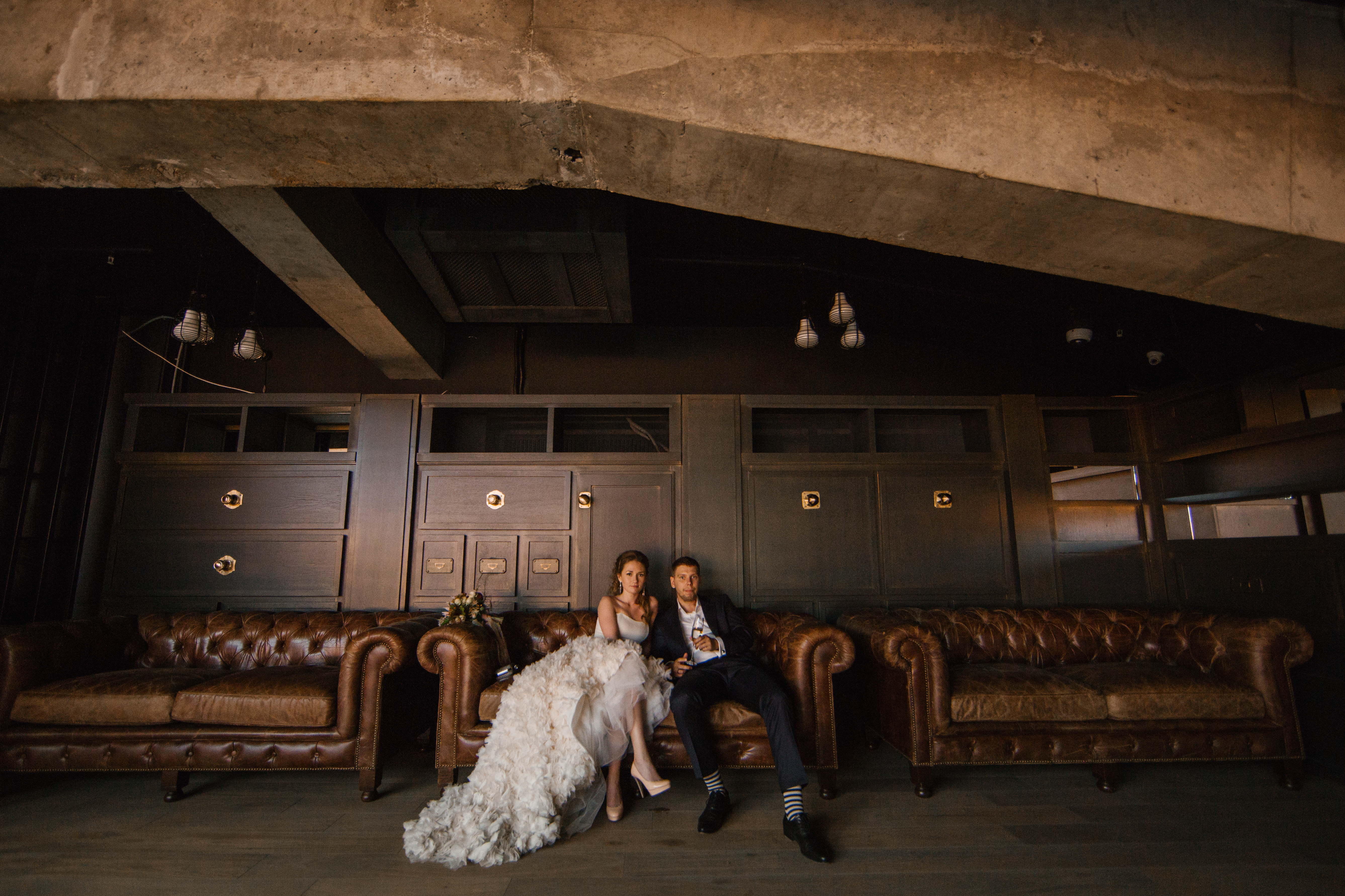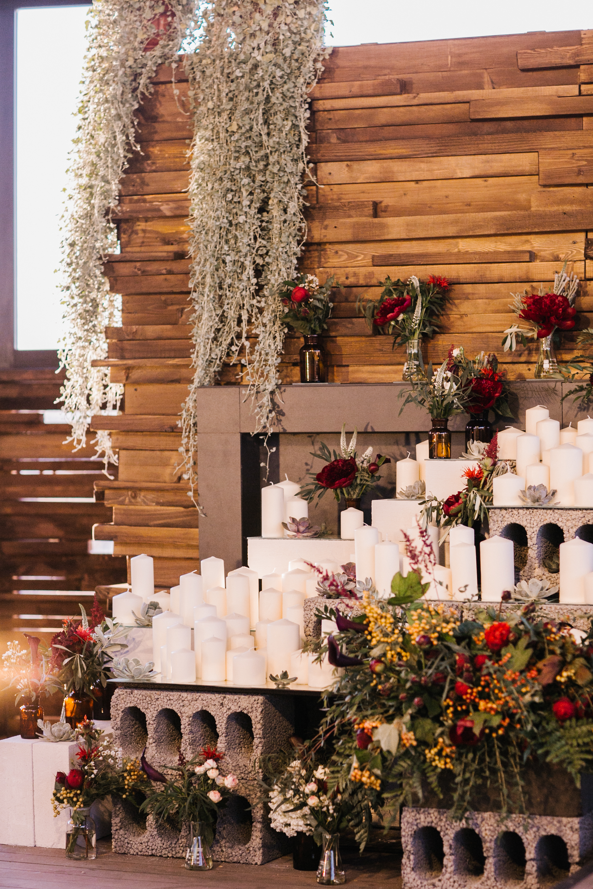 Основные детали: бетон, дерево, свечи, кожа, медные элементы декора и лампы Эдиссона.